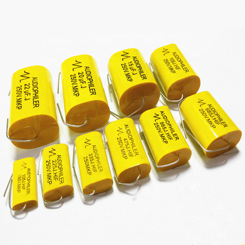 Capacité axiale sans électrode MKP 5% jaune 1UF1.5/1.8/2.2/2.7/3.3/4/4.7/5.6/6.8/8.2/10/12/15/18/20/22/47UF250V
